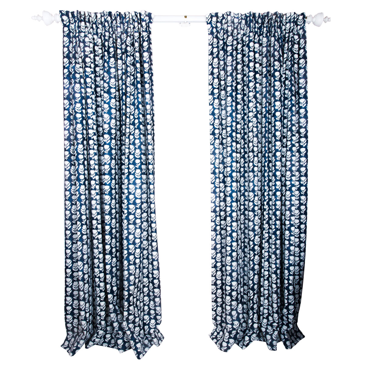 Custom-made pair of curtains in Anna Spiro Textile Marigold Solid Navy fabric. Centre-opening curtains with custom gathered heading and detachable blockout lining. Curtain rod not included.