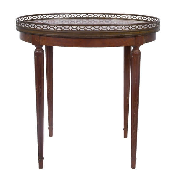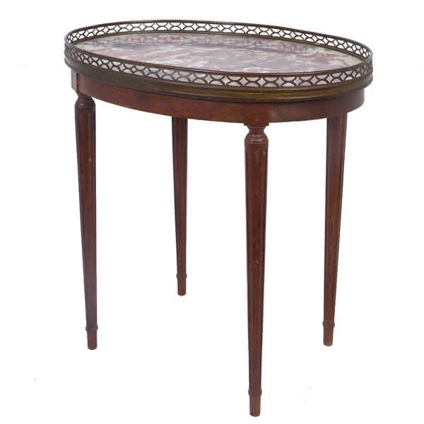 Antique small oval Bouillotte table with marble top, timber legs and brass edge detail.